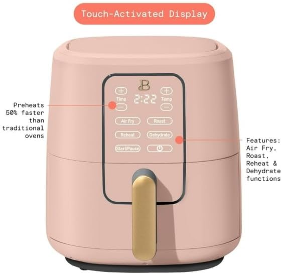 Product detailsThe 6-Quart Air Fryer with TurboCrisp Technology and Touch-Activated Display is perfect easy meals on busy weeknights. Air fry, roast, reheat or dehydrate your favorite meals with the patent-pending TurboCrisp Technology. Thoughtfully designed with sleek, touch-activated illumination and our signature gold accents, the air fryer has a five-pound food capacity ideal for serving five to seven people. Created by Drew Barrymore, Kitchenware combines elegant design and contemporary colors for high-performance appliances that look on your kitchen counter. Create delicious, easy meals with the 6-Quart Air Fryer with TurboCrisp Technology and Touch-Activated Display. Condition: New. Model: 19028. Item dimensions: 15.11 in (L) x 12.08 in (W) x 13.07 in (H). 1750 Watts.Patent-pending TurboCrisp technology for fast, crispy and even cookingOur signature touch-activated display illuminates only when you need it. No dials, buttons or knobsPowerful 1750-watt system with stainless steel provides faster heat-up and cool-down timesLarge 5lb (2lb French fry) food capacity is ideal for chicken wings, small roast chickens, pastries, burgers and moreAir fried favorites have 75% less fat than traditional deep fryingAdjustable temperature ranges from 90°F-400°F to suit a variety of recipesAir fry, roast, reheat and dehydrate with little-to-no oil neededQuickly reheat leftovers with crispy, flavorful results60-minute automatic shut-off function adds safety and peace of mindRemovable crisping tray and pan are dishwasher safe and PFOA/PFOS-free for fast and easy clean-upItem dimensions: 15.11 in (L) x 12..08 in (W) x 13.07 in (H)Model: 19028Condition: new